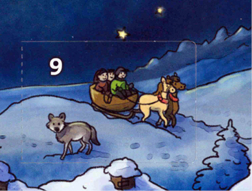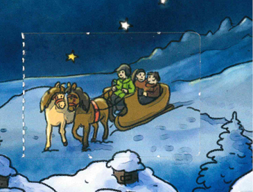 Gemächlich zieht der Schlitten vom Tal den verschneiten Hügel hinauf. Die Pferde haben gut zu tun, doch oben angekommen dürfen sie erst einmal verschnaufen. Der Mond steht hell am Himmel und taucht die Landschaft in silbernes Licht.